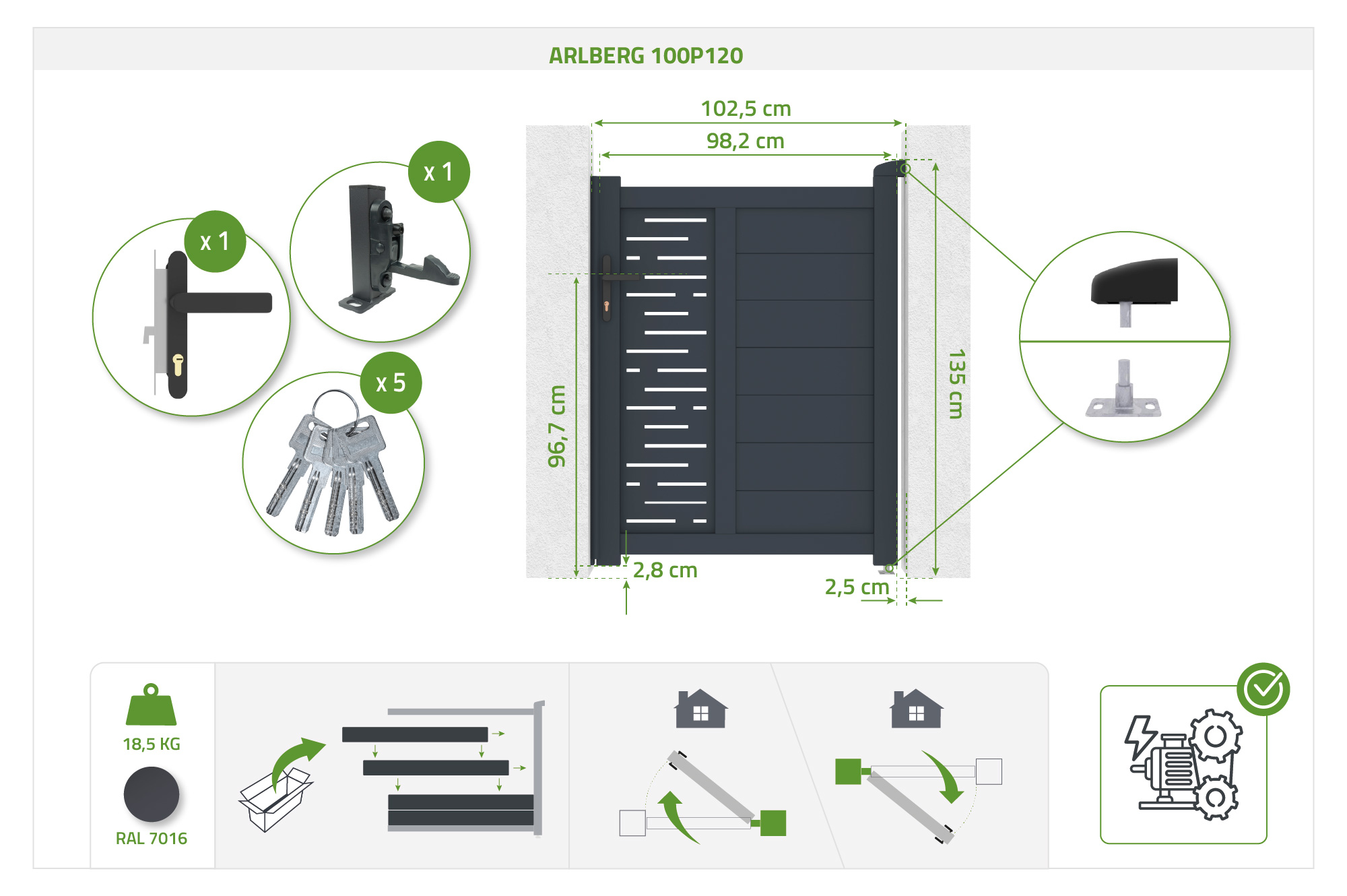 Alla tillbehör som behövs för installationen av din portal tillhandahålls till dig, och allt som ingår i våra portaler specificeras i produktens tekniska egenskaper såväl som i beskrivningen.