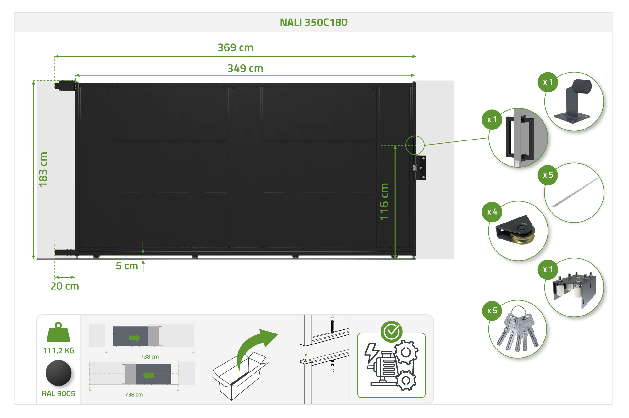 NALI 3,5m skjutgrind i stål, 180 cm hög, svart